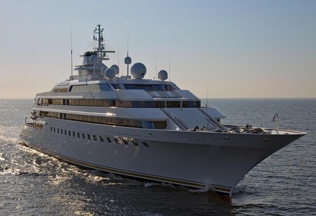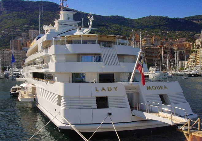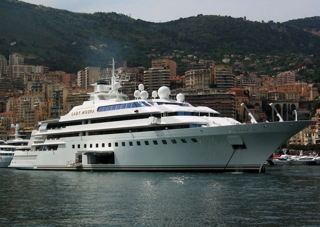 Lady Moura is super-yacht, which is property of the Saudi Arabian businessman Nasser Al-Rashid. The yacht was launched in 1990 and built by Blohm & Voss GmbH in their shipyard in Hamburg, Germany. At the day of launching the super-yacht was the largest private vessel in operation. The overall length of Lady Moura is 104.85 m, the beam is 19.00 m and the draft is 5.40 m. With such dimensions the yacht has gross tonnage of 6,359 GRT and capacity for 12 passengers with double occupancy. Of course the staterooms of the guests are amazing with own ocean-view and large balconies. In addition the yacht offers high comfort for the guests and a lot of attractions. On board there is fitness hall, cinema and art gallery. All the interior is trying to show majesty and luxury. There are a lot of gold ornaments, wooden furniture from highest class. Even the name and the escutcheon that can be seen at port, starboard and at Stern are carved in 24 carat gold. Lady Moura has two bars, restaurant and conference room. The yacht is not just luxury, but one of the most impressive vessel built ever.